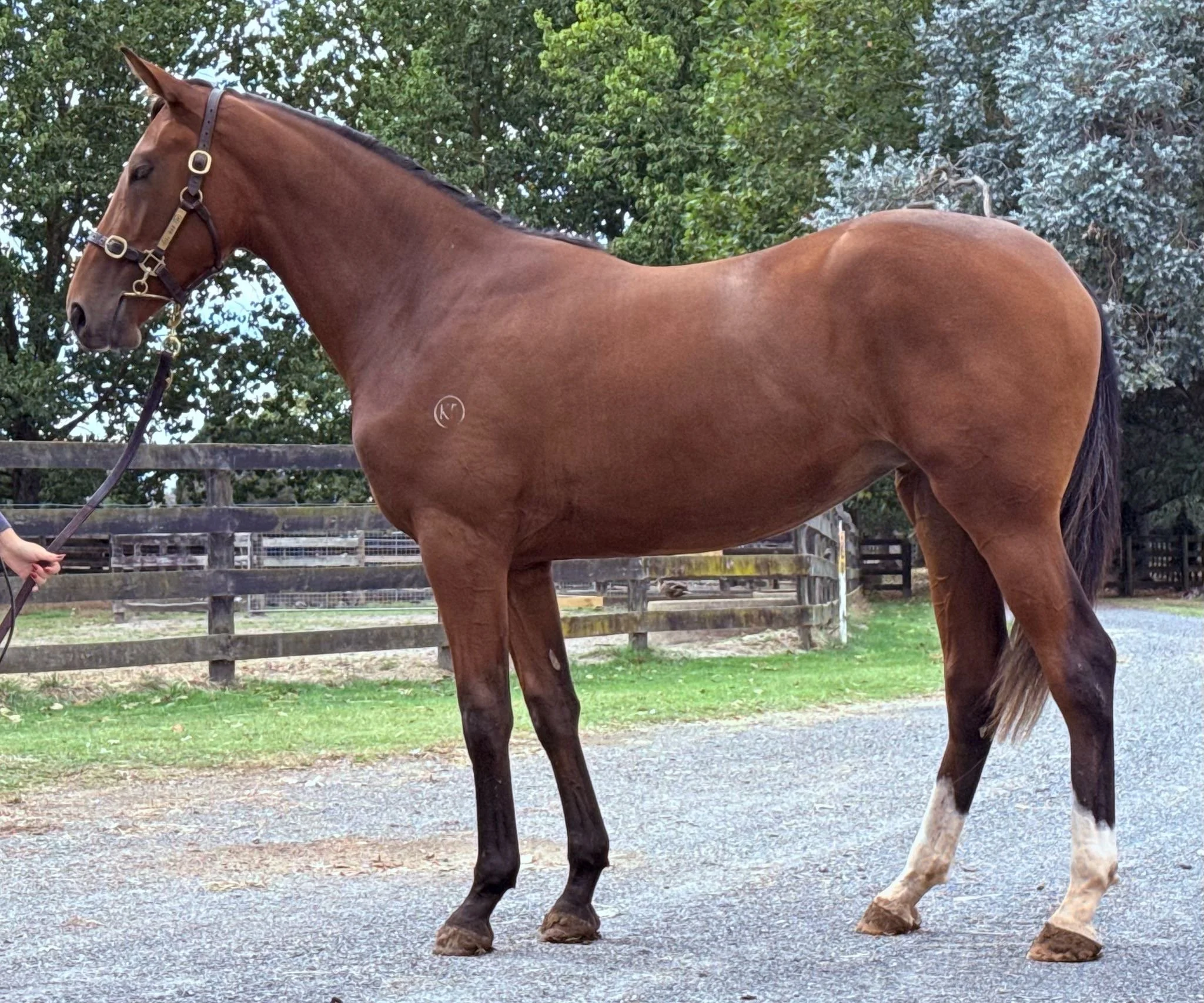 This smart, leggy, scopey 2YO filly by Satono Aladdin has been broken in and has done some light education. To be trained by the great Wexford Stables she is a 3YO prospect. Her elite pedigree boasts her successful close relatives G1 Oaks placed Aspen Colorado, Her dam G2 placegetter Canuhandleajandal and many more. I Stole A Manolo is affectionately known as “Sandie”. She is an impressive horse that emulates her sire in physicality & we will be looking at races like the Oaks for her.